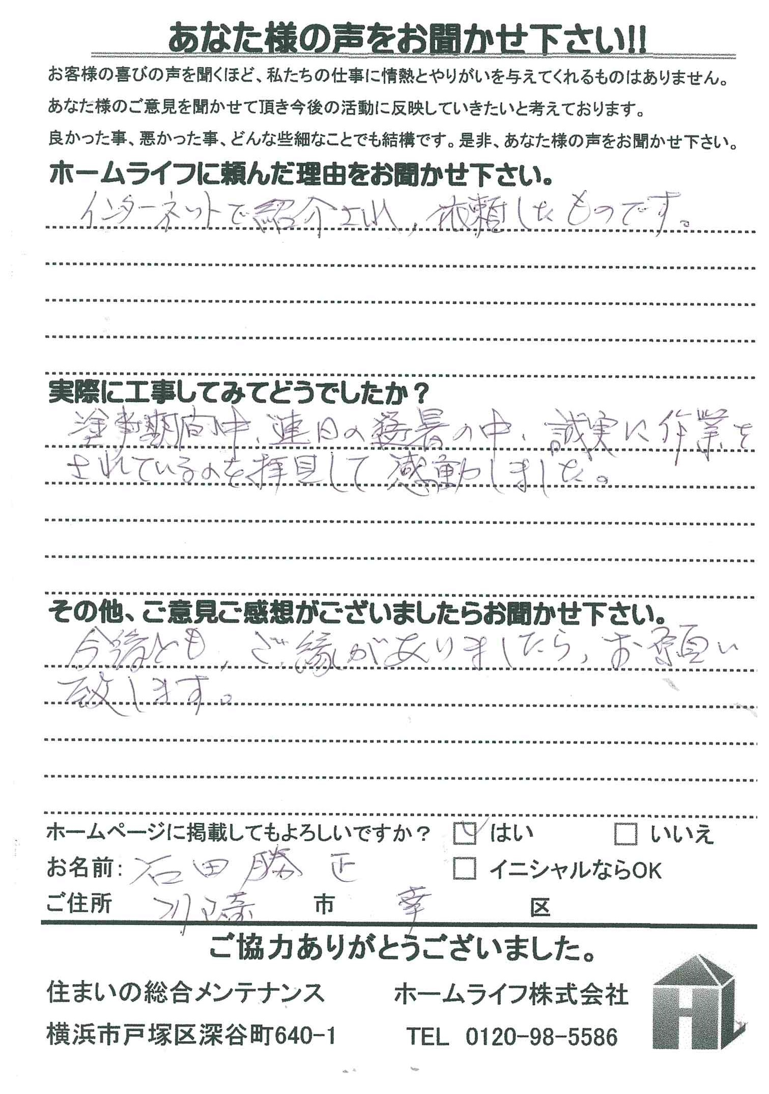 石田様 川崎市幸区 ホームライフに頼んだ理由は? インターネットで紹介され、依頼したものです。 実際に工事してみてどうでしたか 塗装期間中、連日の猛暑の中、誠実に作業をさているのを拝見して感動しました。 その他、ご意見ご感想がございましたらお聞かせください 今後とも、ご縁がありましたらお願い致します。