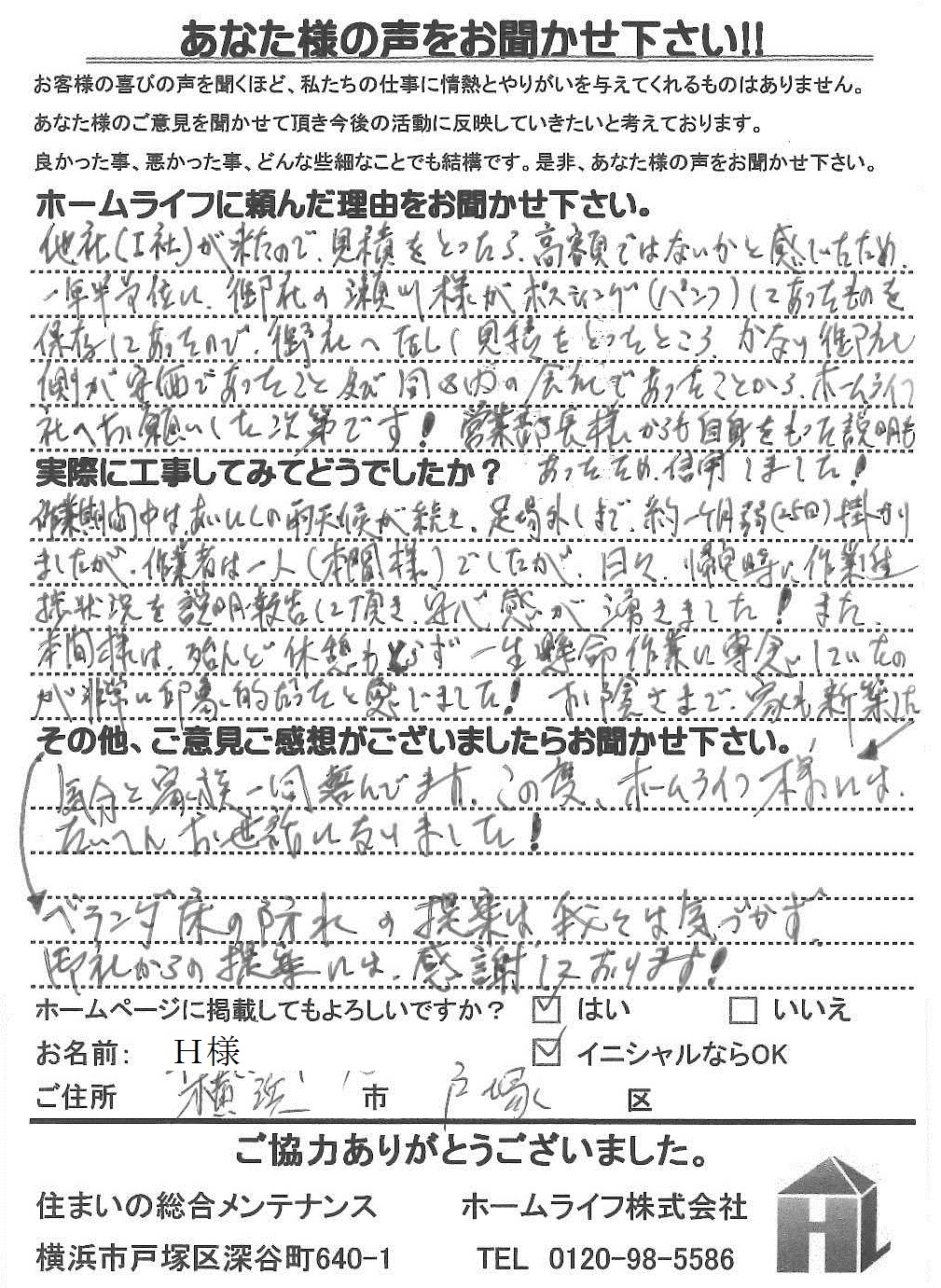 ベランダ床の防水の提案は我々は気づかず、御社からの提案には感謝しております。 -