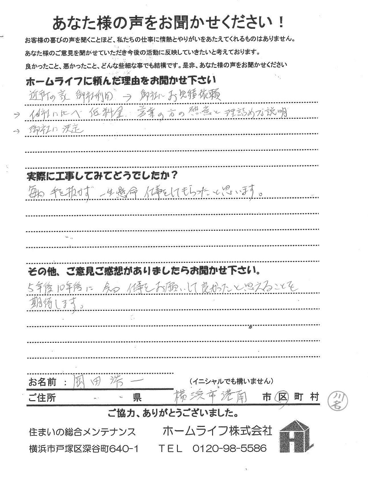 岡田様 横浜市港南区 ホームライフに頼んだ理由は? 近所の家が御社利用のため、見積りを依頼しました。 他社に比べ、低料金、営業の方の熱意と理詰めな説明で御社に決定しました。 実際に工事してみてどうでしたか 毎日手を抜かず一生懸命仕事をしてもらったと思います。 その他、ご意見ご感想がございましたらお聞かせください 5年後10年後に今回仕事をして良かったと思えることを期待します。