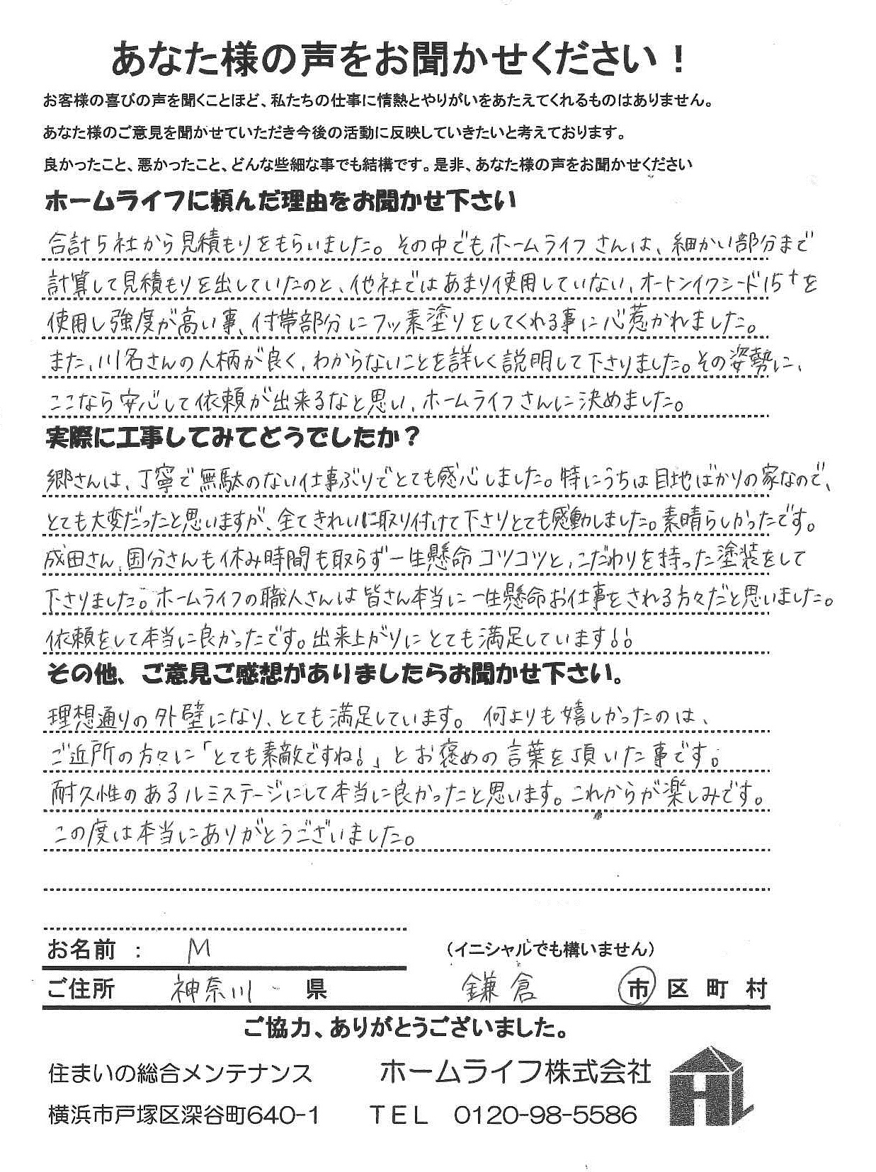 成田さん、国分さんも休み時間も取らず一生懸命コツコツとこだわりを持った塗装をして下さりました。ホームライフの職人さんは皆さん本当に一生懸命お仕事をされる方々だと思いました。依頼をして本当に良かったです。出来上がりにとても満足しています。 - その他、ご意見ご感想がございましたらお聞かせください