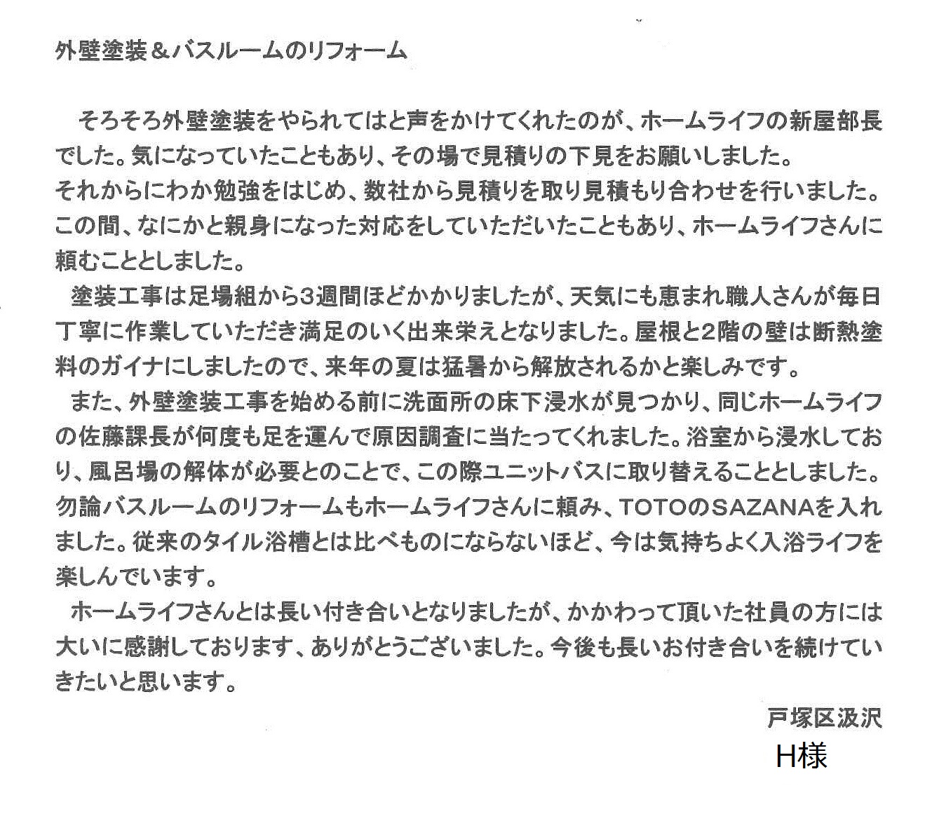 天気にも恵まれ職人さんが毎日丁寧に作業をしていただき満足のいく出来栄えとなりました。屋根と2階の壁は断熱塗料のガイナにしましたので、夏は猛暑から解放されるかと楽しみです。また、外壁塗装工事を始める前に洗面所の床下浸水が見つかり、ホームライフの佐藤課長が何度も足を運んで原因調査に当たってくれました。浴室から浸水しており、風呂場の解体が必要とのことで、この際ユニットバスに取り替えることとしました。勿論、バスルームのリフォームもホームライフさんに頼み、TOTOのSAZANAを入れました。従来のタイル浴槽とは比べ物にならないほど、今は気持ちよく入浴ライフを楽しんでいます。 - その他、ご意見ご感想がございましたらお聞かせください