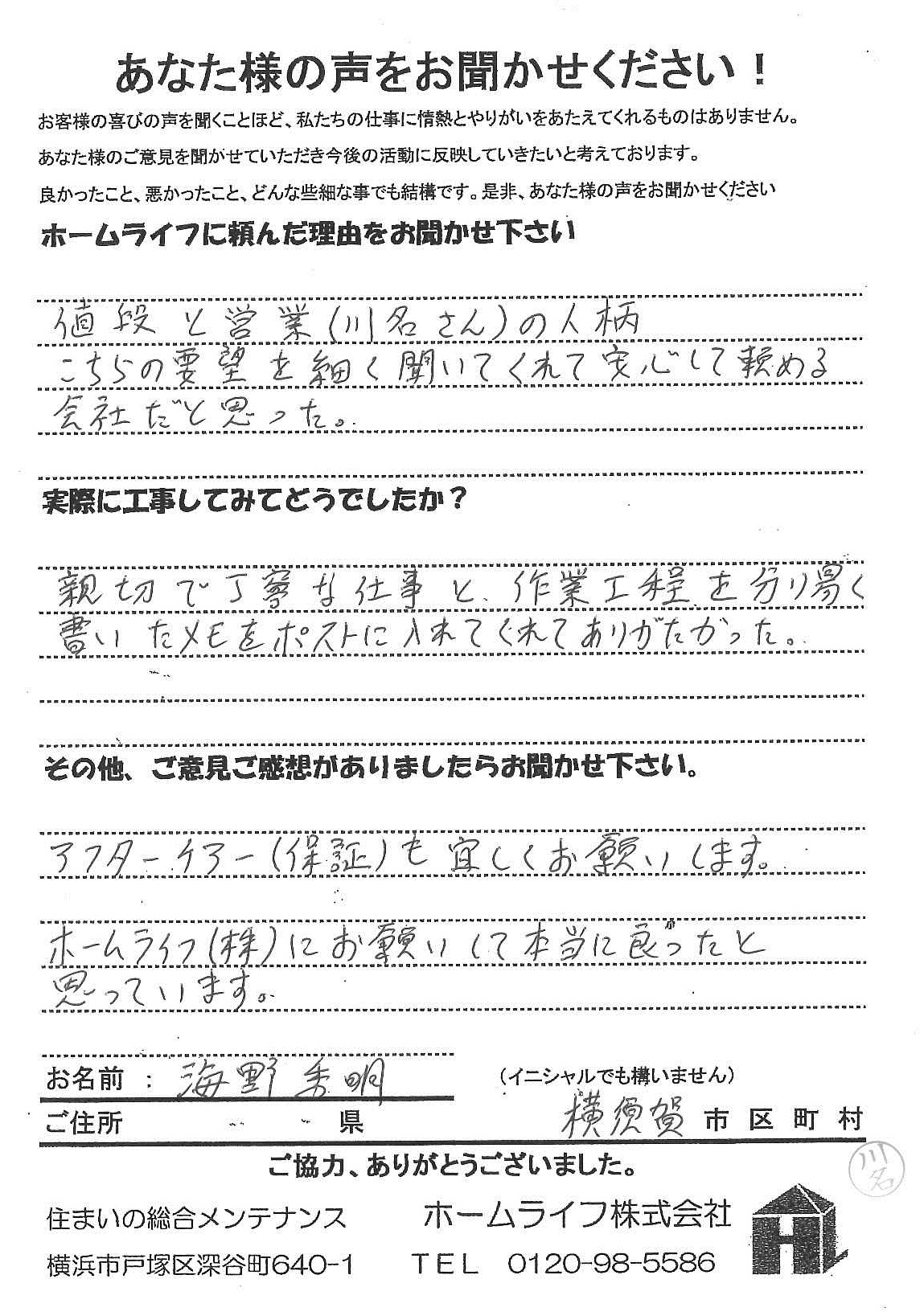 海野様 横須賀市 ホームライフに頼んだ理由は? 値段と営業(川名さん)の人柄 こちらの要望を細かく聞いてくれて安心して頼める会社だと思った。 実際に工事してみてどうでしたか 親切で丁寧な仕事と作業工程を分かり易く書いたメモをポストに入れてくれてありがたかった。 その他、ご意見ご感想がございましたらお聞かせください アフターケアー(保証)も宜しくお願いします。 ホームライフ㈱にお願いして本当に良かったと思っています。