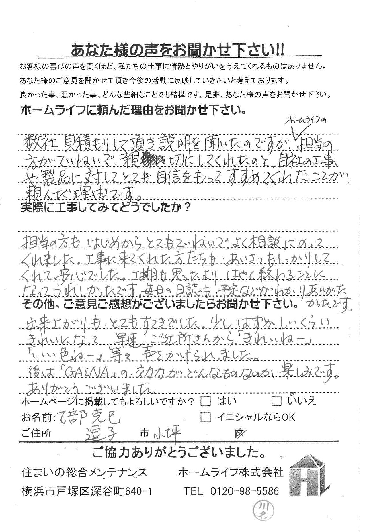 数社見積りして頂き説明を聞いたのですが、ホームライフの担当の方が丁寧で親切にしてくれたのと、自社の工事や製品に対してとても自信をもって勧めてくれたことが頼んだ理由です。 - 実際に工事してみてどうでしたか