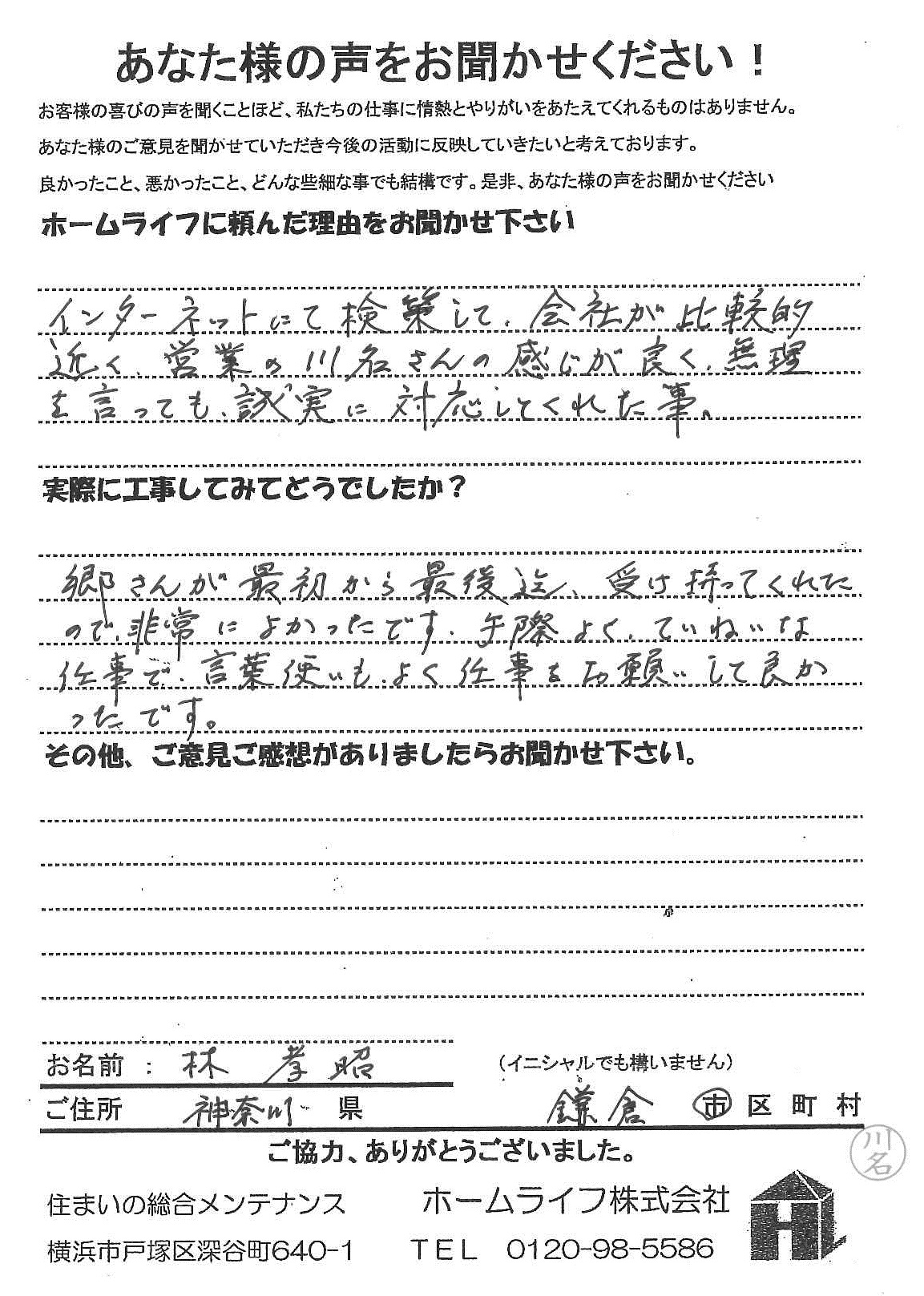 林様 鎌倉市 ホームライフに頼んだ理由は? インターネットにて検索して、会社が比較的近く営業の川名さんの感じが良く無理を言っても誠実に対応してくれた事。 実際に工事してみてどうでしたか 郷さんが最初から最後まで受け持ってくれたので、非常に良かったです。手際よく丁寧な仕事で言葉使いもよく仕事をお願いして良かったです。