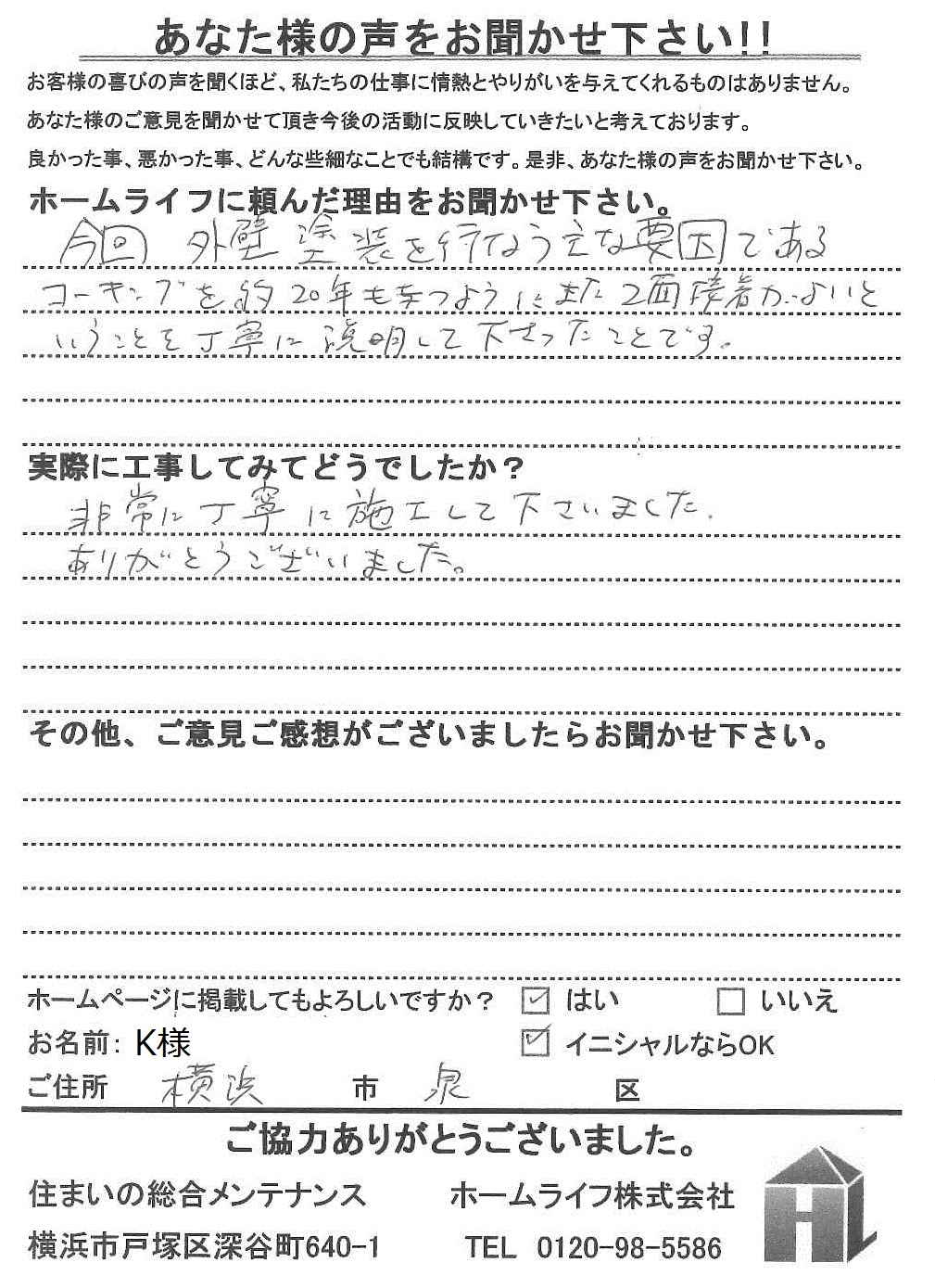 K様 横浜市泉区 ホームライフに頼んだ理由は? 今回、外壁塗装を行なう主な要因であるコーキングを約20年持つように、また、2面接着が良いということを丁寧に説明して下さったことです。 実際に工事してみてどうでしたか 非常に丁寧に施工して下さいました。ありがとうございました。