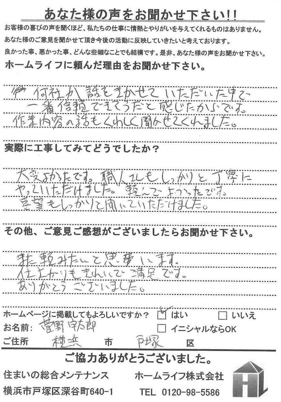 菅野様 横浜市戸塚区 ホームライフに頼んだ理由は? 何社か話を聞かせていただいた中で一番信頼できそうだと感じたからです。 作業内容の話も詳しく聞かせてくれました。 実際に工事してみてどうでしたか 大変良かったです。職人さんもしっかりと丁寧にやっていただけました。頼んでよかったです。 要望もしっかりと聞いていただけました。 その他、ご意見ご感想がございましたらお聞かせください また、頼みたいと思います。 仕上がりもきれいで満足です。 ありがとうございました。