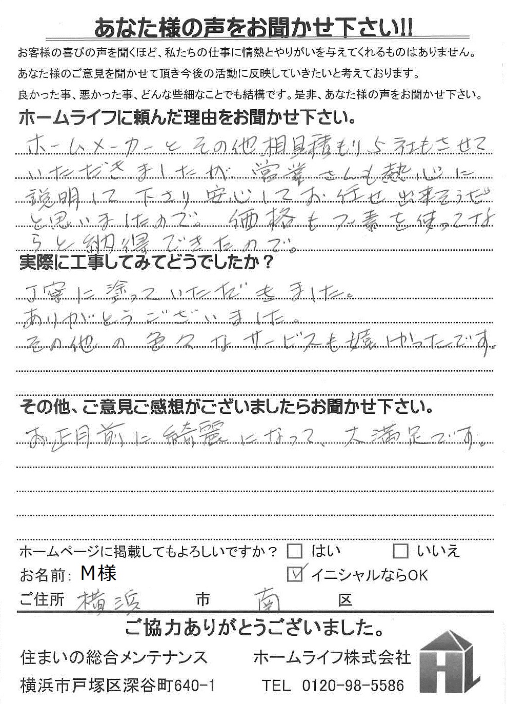 M様 横浜市南区 ホームライフに頼んだ理由は? ホームメーカーとその他相見積もり5社もさせていただきましたが、営業さんも熱心に説明して下さり安心してお任せ出来そうだと思いましたので。価格もフッ素を使ってならと納得できたので。 実際に工事してみてどうでしたか 丁寧に塗っていただきました。 ありがとうございました。 その他の色々なサービスも嬉しかったです。 その他、ご意見ご感想がございましたらお聞かせください お正月前に綺麗になって大満足です。