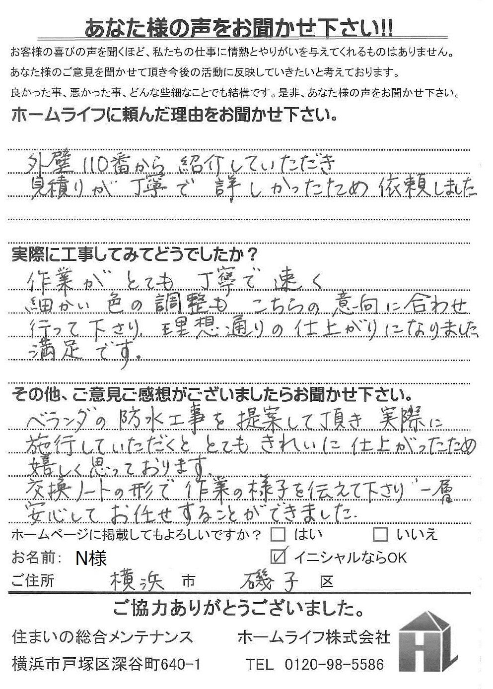 ベランダ防水工事を提案して頂き、実際に施工していただくととても綺麗に仕上がったため、嬉しく思っております。交換ノートの形で作業の様子を伝えて下さり、一層安心してお任せすることができました。 -