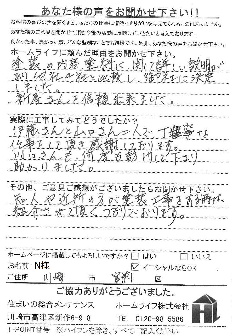 N様 川崎市宮前区 ホームライフに頼んだ理由は? 塗装の内容・塗料に関して詳しい説明があり、他社4社と比較し御社に決定しました。 新屋さんを信頼出来ました。 実際に工事してみてどうでしたか 伊東さんと山口さん二人で丁寧な仕事をして頂き、感謝しております。 川口さんも何度も訪問して下さり、助かりました。 その他、ご意見ご感想がございましたらお聞かせください 知人や近所の方が塗装工事をする時は、紹介させて頂くつもりでおります。
