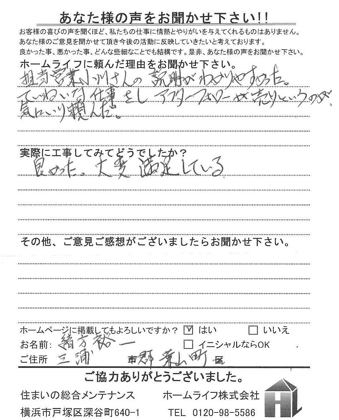 緒方様 三浦郡葉山 ホームライフに頼んだ理由は? 担当小川さんの説明がわかりやすかった。 丁寧な仕事をしアフターフォローが売りというのが気に入り頼んだ。 実際に工事してみてどうでしたか 良かった。大変満足している。
