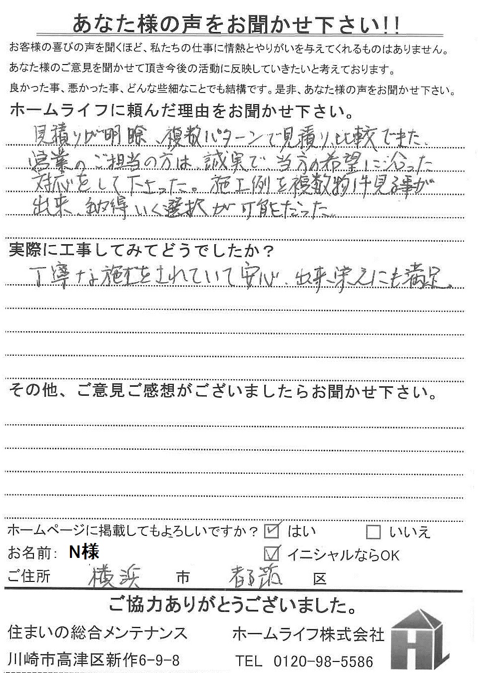 N様 横浜市都筑区 ホームライフに頼んだ理由は? 見積りが明瞭・複数パターンで見積り比較できた。 営業のご担当の方は誠実で当方の希望に沿った対応をして下さった。 施工例を複数物件見る事が出来、納得いく選択が可能だった。 実際に工事してみてどうでしたか 丁寧な施工をされていて安心。出来栄えにも満足。