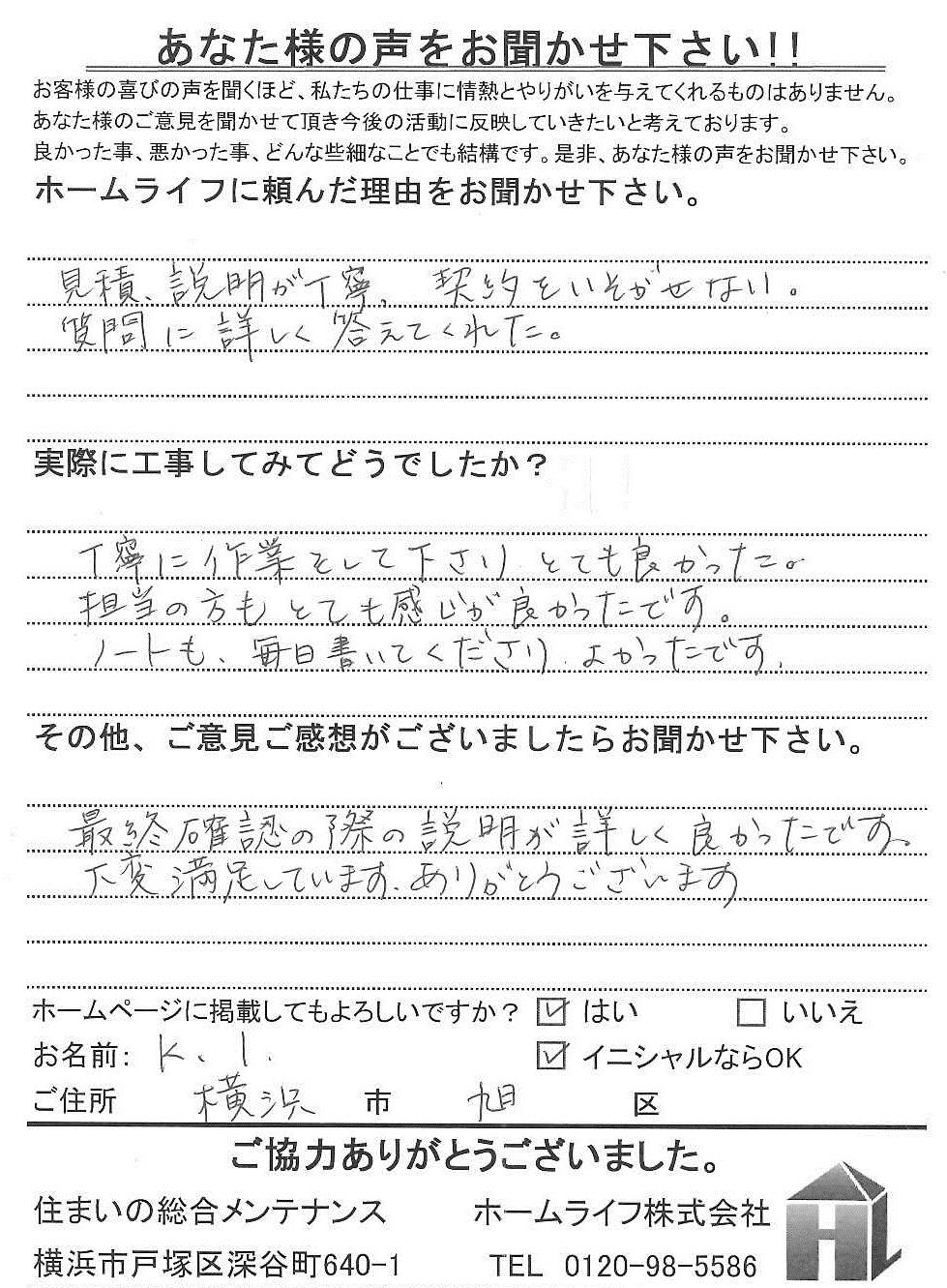 K様 横浜市旭区 ホームライフに頼んだ理由は? 見積、説明が丁寧、契約を急がせない。 質問に詳しく答えてくれた。 実際に工事してみてどうでしたか 丁寧に作業をして下さり、とても良かった。 担当の方もとても感じが良かったです。 ノートも毎日書いてくださり、良かったです。 その他、ご意見ご感想がございましたらお聞かせください 最終確認の際の説明が詳しく良かったです。 大変満足しています。ありがとうございます。