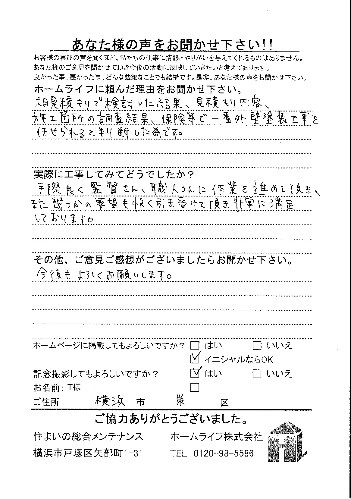 T様 横浜市栄区 ホームライフに頼んだ理由は? 相見積もりで検討した結果、見積もり内容、施工箇所の調査結果、保険等で一番外壁塗装工事を任せられると判断した為です。 実際に工事してみてどうでしたか 手際良く監督さん、職人さんに作業を進めて頂き、また幾つかの要望も快く引き受けて頂き、非常に満足しております。 その他、ご意見ご感想がございましたらお聞かせください 今後もよろしくお願いします。