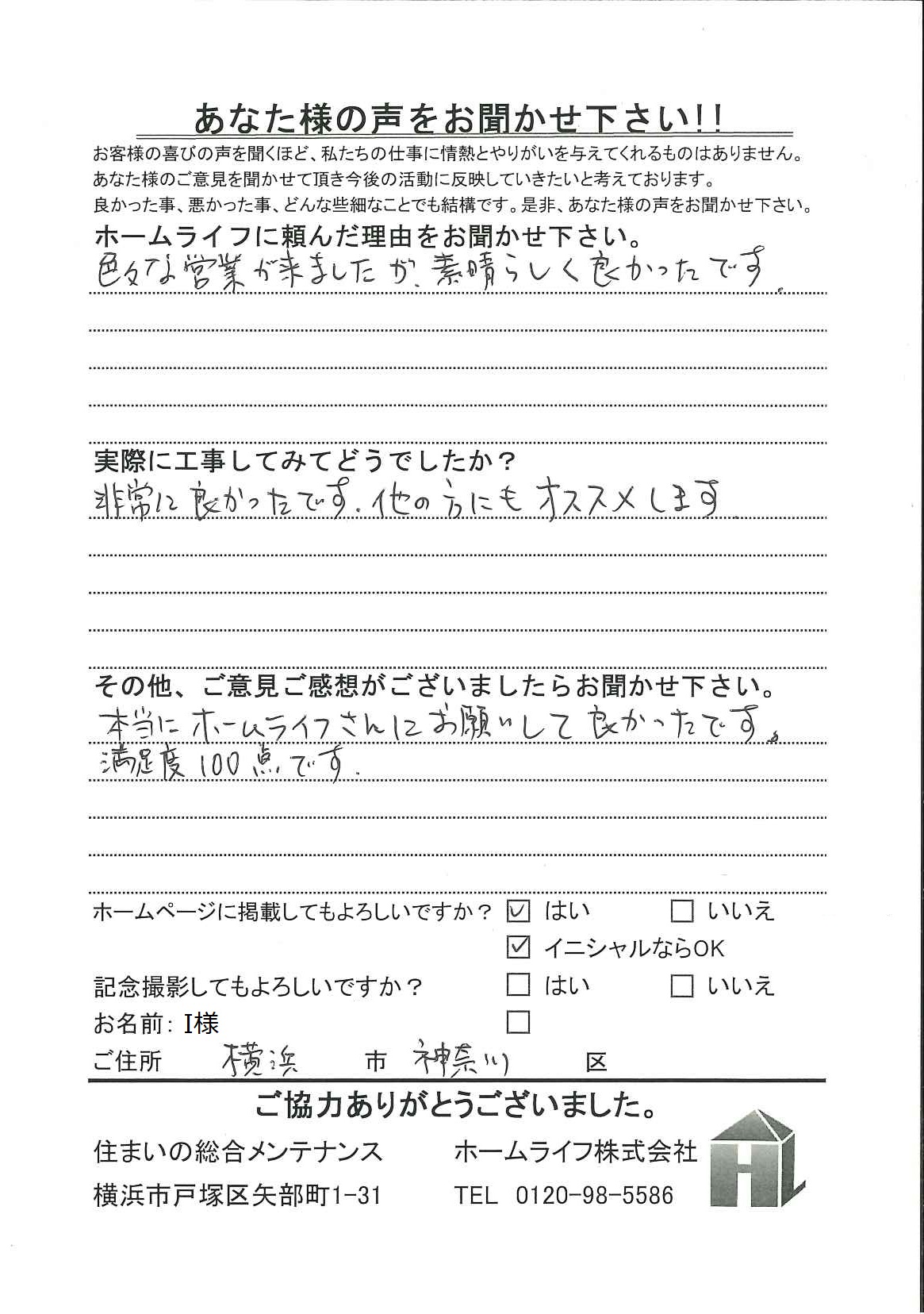 I様 横浜市神奈川区 ホームライフに頼んだ理由は? 色々な営業が来ましたら、素晴らしく良かったです。 実際に工事してみてどうでしたか 非常に良かったです。他の方にもオススメします。 その他、ご意見ご感想がございましたらお聞かせください 本当にホームライフさんにお願いして良かったです。 満足度100点です。