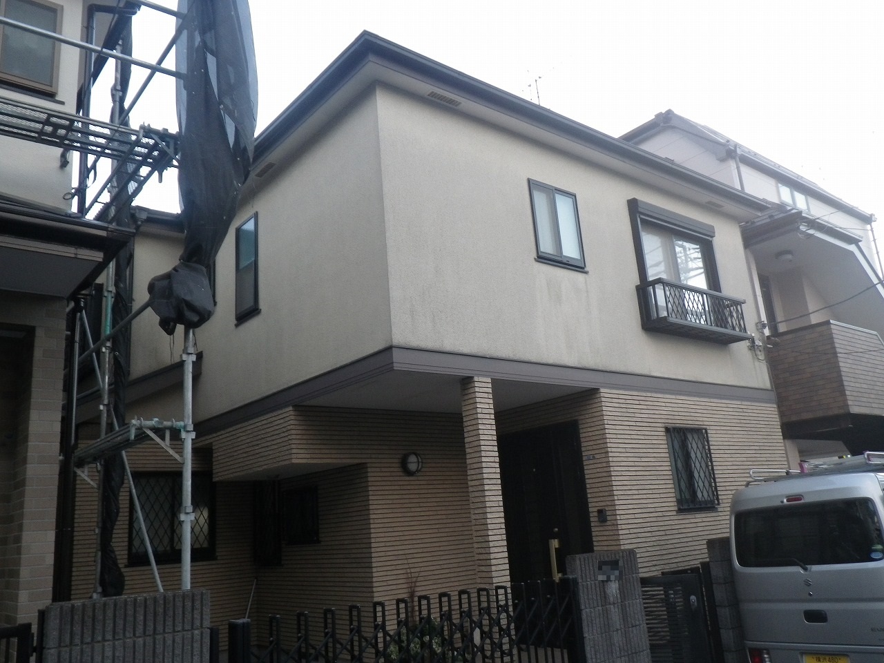 洗浄後、ケレン処理します。塗装する前に浮いている古い塗膜を落とし、細かい傷を付けて密着性を良くします。下塗り後中塗りします。塗料をたっぷり付けて塗装します。