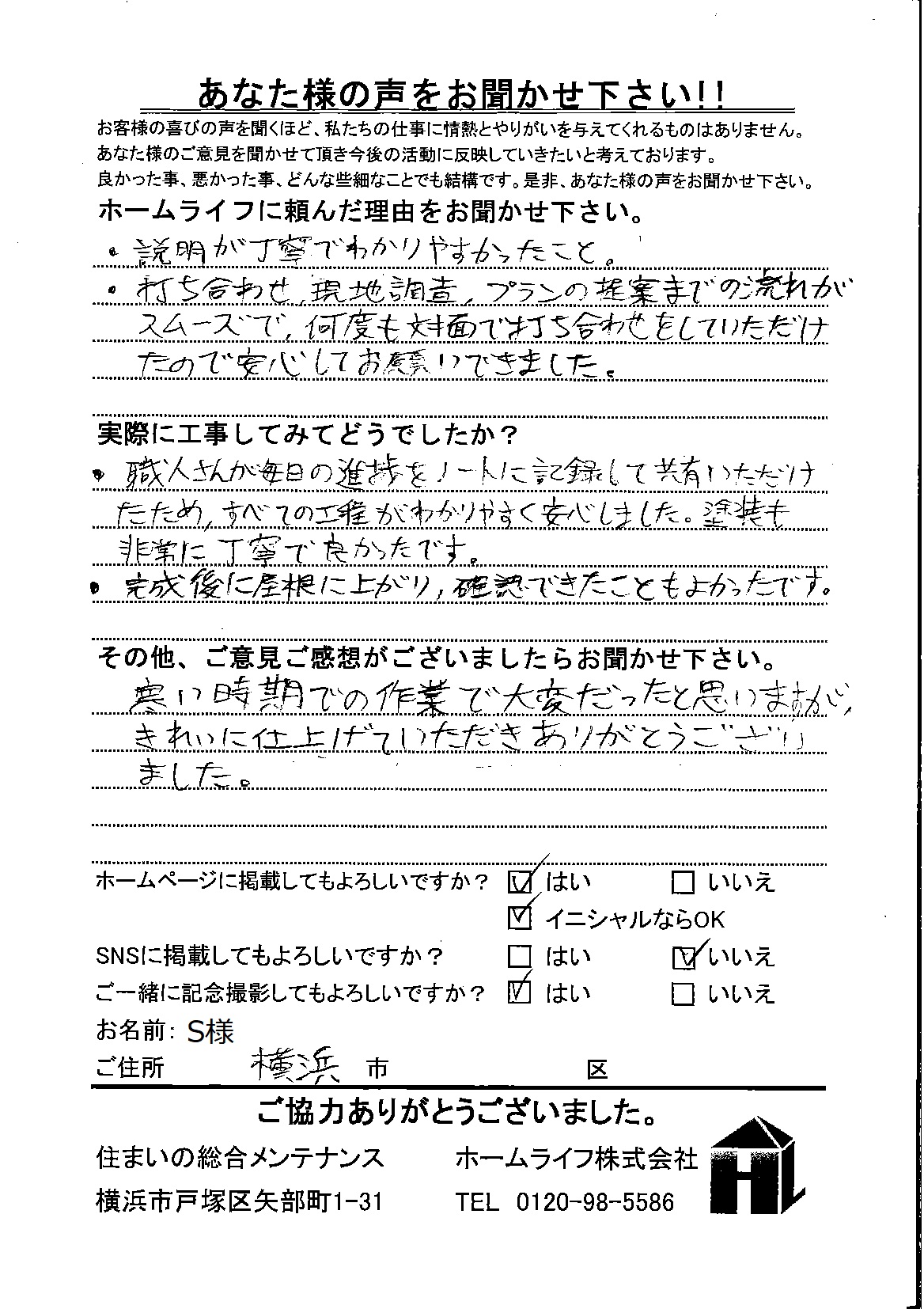 ・職人さんが毎日の進捗をノートに記録して共有いただけたため、すべての工程がわかりやすく安心しました。塗装も非常に丁寧で良かったです。