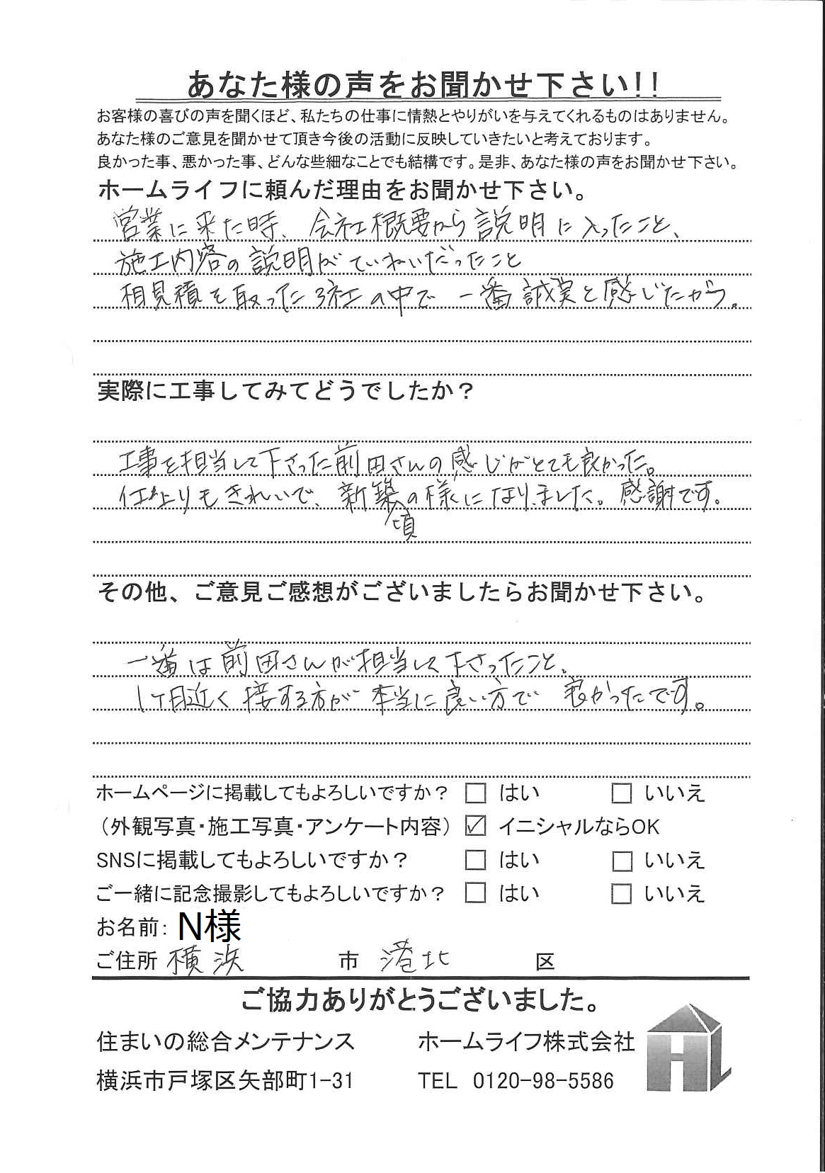 N様 横浜市港北区 ホームライフに頼んだ理由は? 営業に来た時、会社概要から説明に入ったこと。 施工内容の説明がていねいだったこと。 相見積を取った3社の中で一番誠実と感じたから。 実際に工事してみてどうでしたか 工事を担当して下さった前田さんの感じがとても良かった。 仕上がりもきれいで新築頃の様になりました。 感謝です。 その他、ご意見ご感想がございましたらお聞かせください 一番は前田さんが担当して下さったこと。 1ヵ月近く接する方が本当に良い方で良かったです。