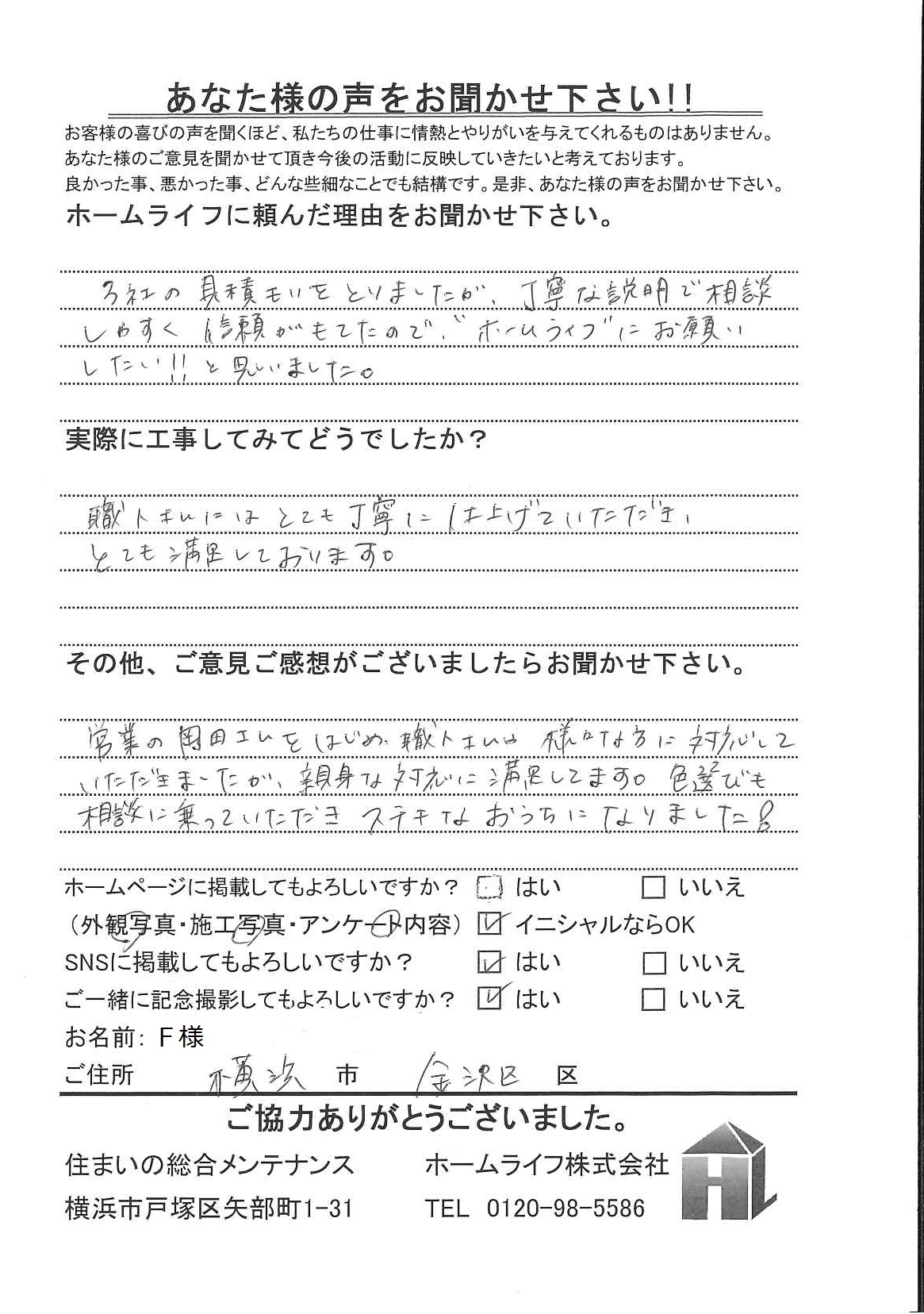 F様 横浜市金沢区 ホームライフに頼んだ理由は? 3社の見積もりをとりましたが、丁寧な説明で相談しやすく信頼がもてたので、”ホームライフ”にお願いしたい!!と思いました。 実際に工事してみてどうでしたか 職人さんにはとても丁寧に仕上げていただき、とても満足しております。 その他、ご意見ご感想がございましたらお聞かせください 営業の岡田さんをはじめ、職人さんや様々な方に対応していただきましたが、親身な対応に満足してます。 色選びも相談に乗っていただき、ステキなおうちになりました!