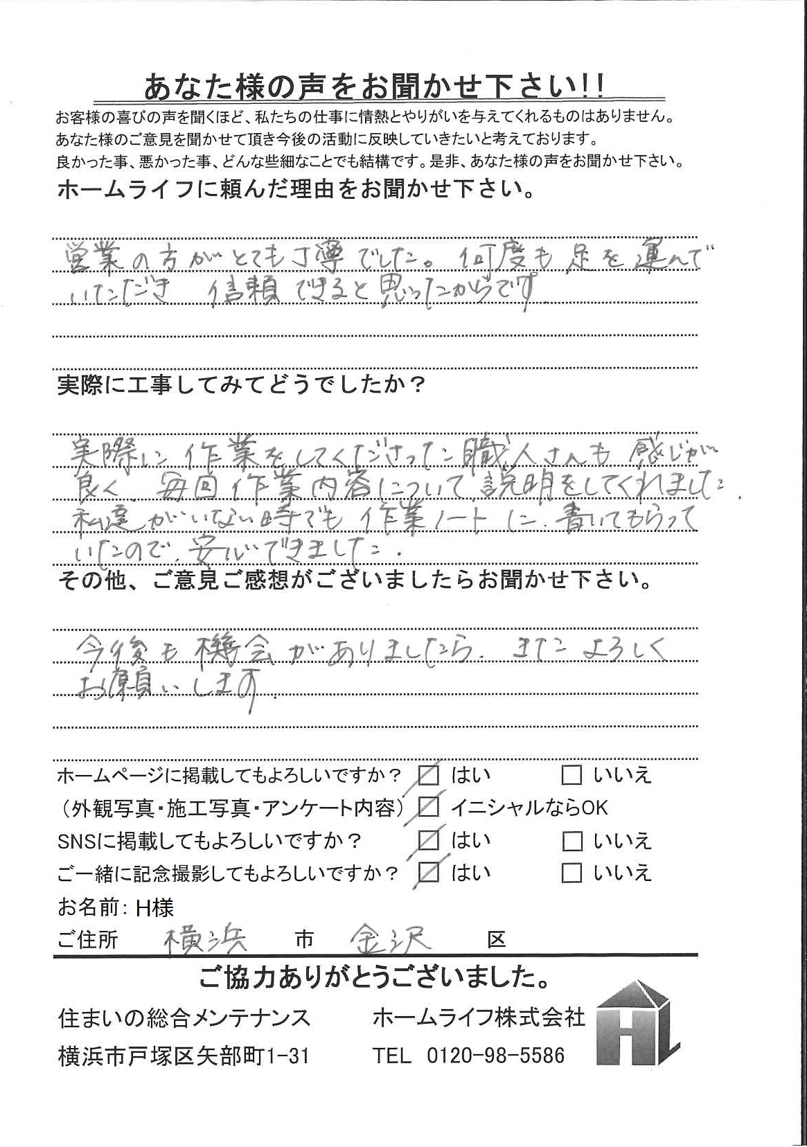 H様 横浜市金沢区 ホームライフに頼んだ理由は? 営業の方がとても丁寧でした。 何度も足を運んでいただき信頼できると思ったからです。 実際に工事してみてどうでしたか 実際に作業をしてくださった職人さんも感じが良く、毎回作業内容について説明をしてくれました。 私達がいない時でも作業ノートに書いてもらっていたので、安心できました。 その他、ご意見ご感想がございましたらお聞かせください 今後も機会がありましたら、またよろしくお願いします。