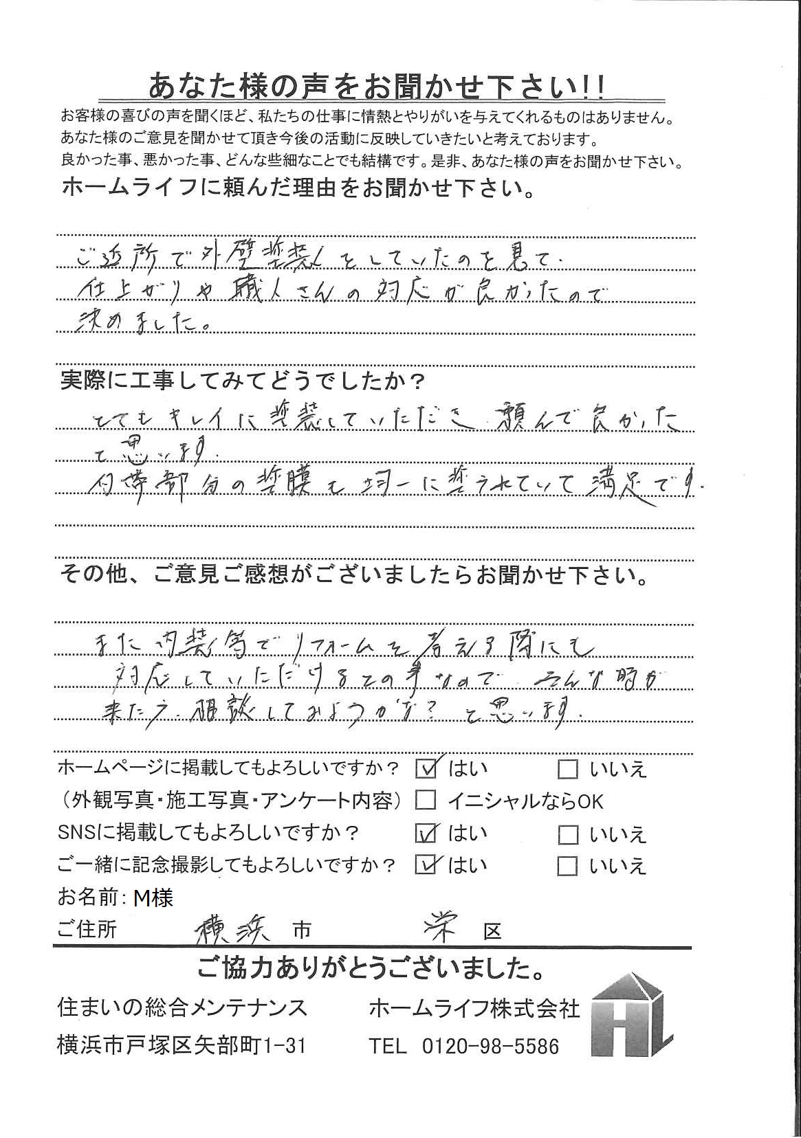 M様 横浜市栄区 ホームライフに頼んだ理由は? ご近所で外壁塗装をしていたのを見て、仕上がりや職人さんの対応が良かったので決めました。 実際に工事してみてどうでしたか とてもキレイに塗装していただき頼んで良かったと思います。 付帯部分の塗膜も均一に塗られていて満足です。 その他、ご意見ご感想がございましたらお聞かせください また、内装等でリフォームを考える際にも対応していただけるとの事なので、そんな時が来たら相談してみようかな?と思います。