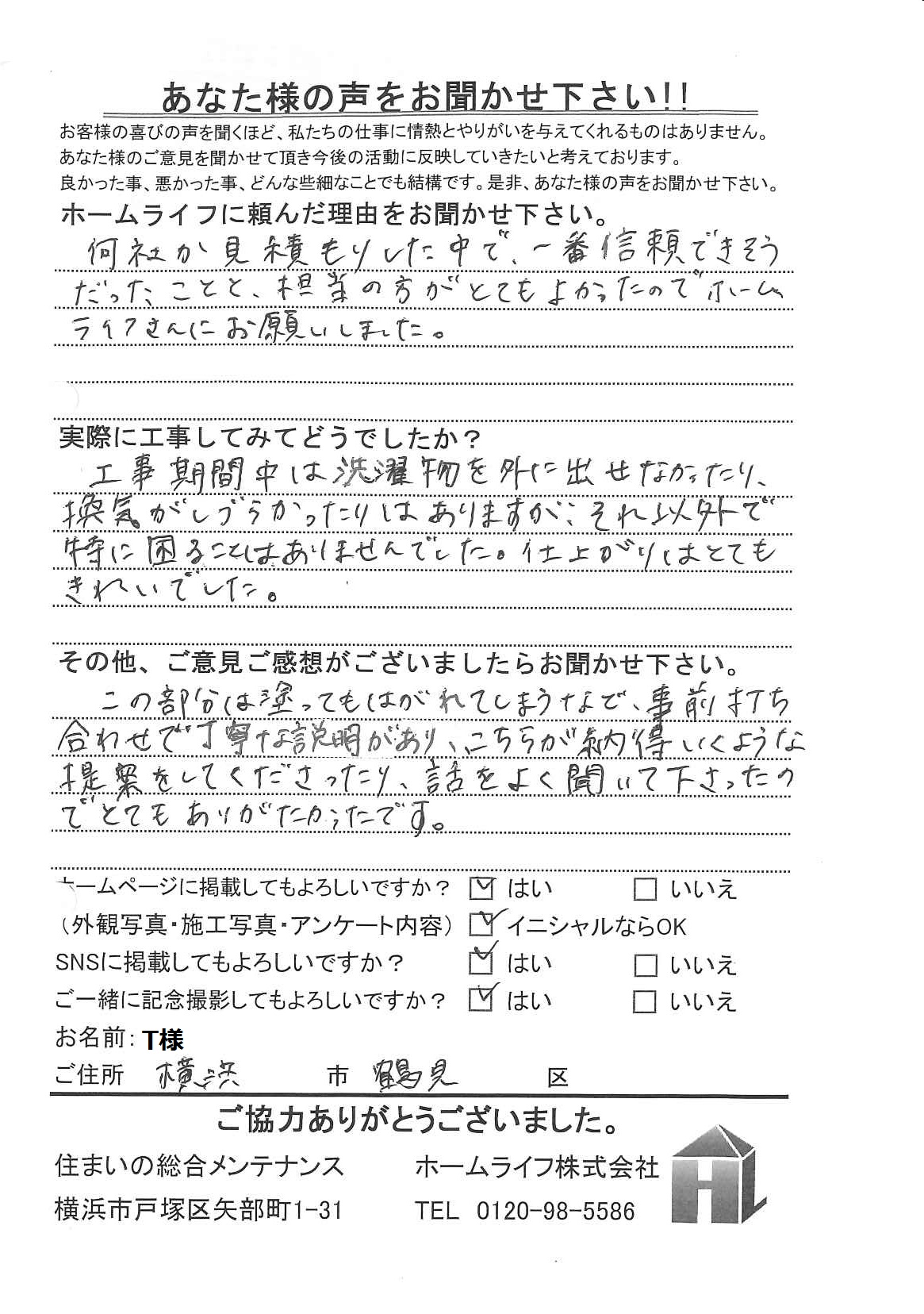 何社か見積もりした中で一番信頼できそうだったことと、担当の方がとてもよかったので、ホームライフさんにお願いしました。 - 実際に工事してみてどうでしたか